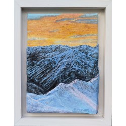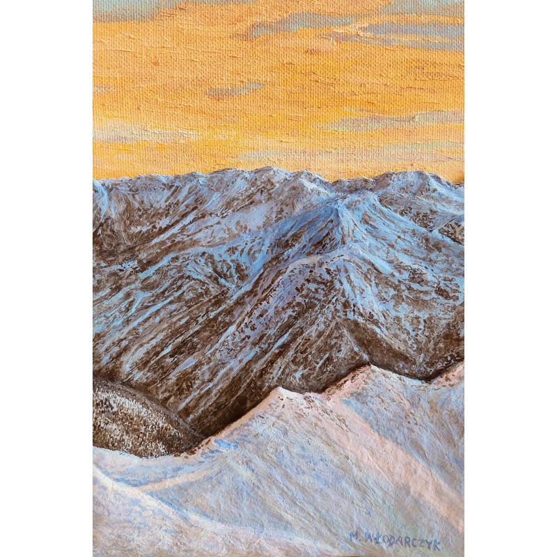 Obraz przedstawia widok z Kasprowego Wierchu. Na pierwszym i drugim planie góry zrobione są z masy papierowej, a potem pomalowane farbami akrylowymi. Natomiast niebo namalowane jest farbą olejną. Całość sprawia wrażenie trójwymiarowe (3D).