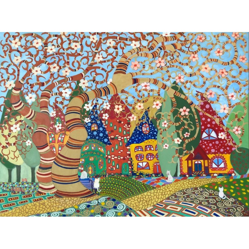 Moje dziecięce marzenie pokazuje marzenie dziecka o radosnym i bezpiecznym domu, kolorowe domki, koty i przyroda wokół to wyraz miłości i pokoju jakiego każde dziecko pragnie, inspiracja - Klimt