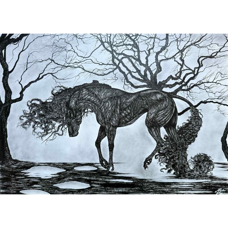 Mistyczne zwierzę, stąpające wśród surowej przestrzeni, gdzie otchłań staje się pustką. Opadający grunt, bezkres bez horyzontu. Istota sama jest jedynym swoim oparciem.