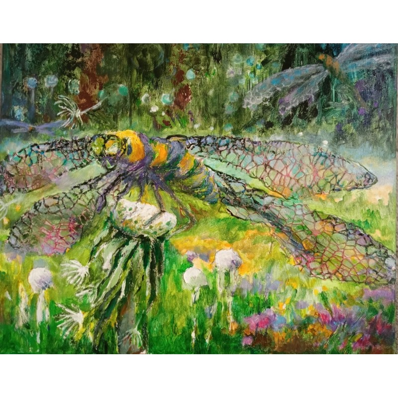 Obraz został namalowany w 2024r. Moja fascynacja owadami i pięknem przyrody skłoniła mnie do namalowania kilku obrazów przedstawiających łąki, pola, kwiaty i ważki. Na obrazie zastosowałam pogrubienia i pewien rodzaj siatki, co podkreśla lekkośc oraz świetlistość skrzydełek a jednocześnie tajemniczość leśnej polany.