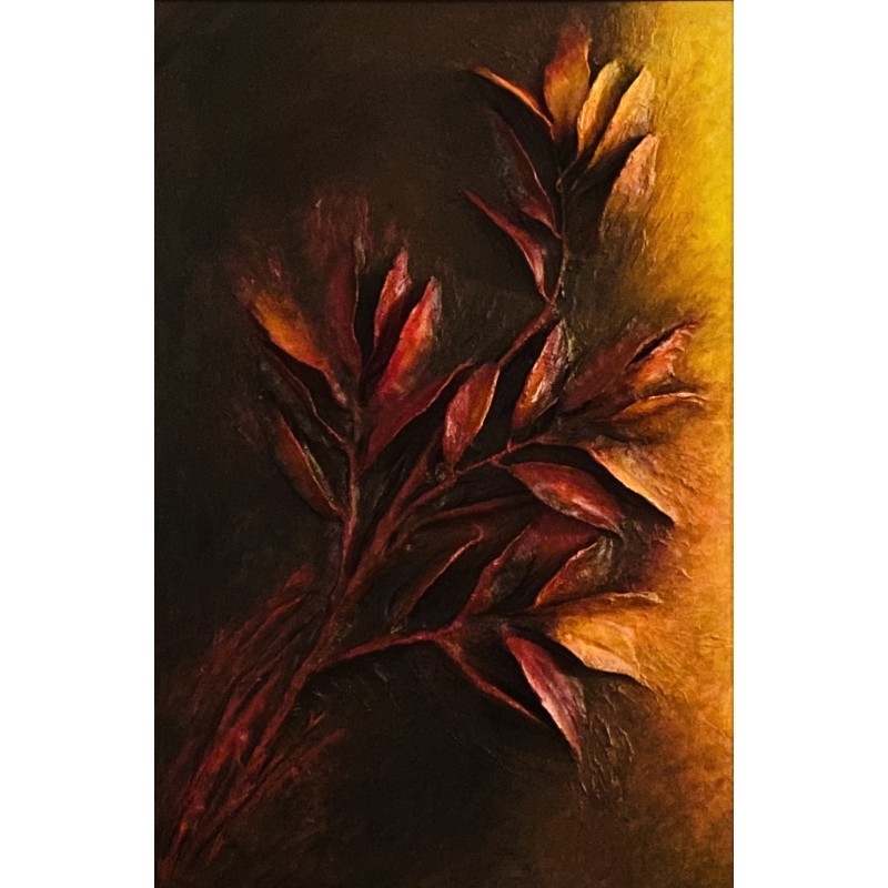 Obraz przedstawia stylizowaną kompozycję roślinną o wyrazistej, diagonalnej formie. Struktura gałęzi i liści zdecydowanie wychodzi poza powierzchnię panelu malarskiego tworząc w efekcie pracę przestrzenną.