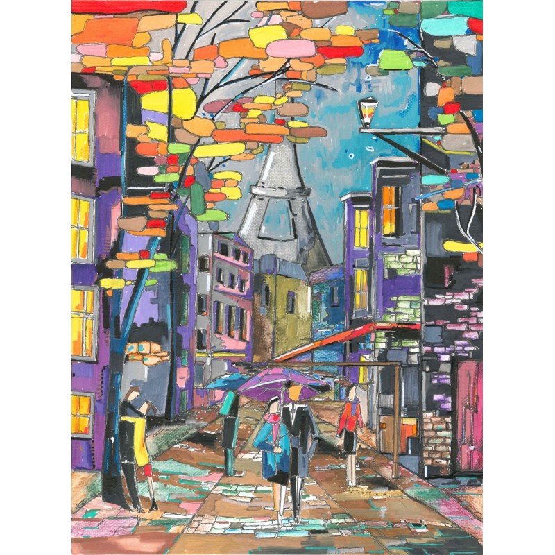 Obraz przedstawia paryską drogę w deszczu.