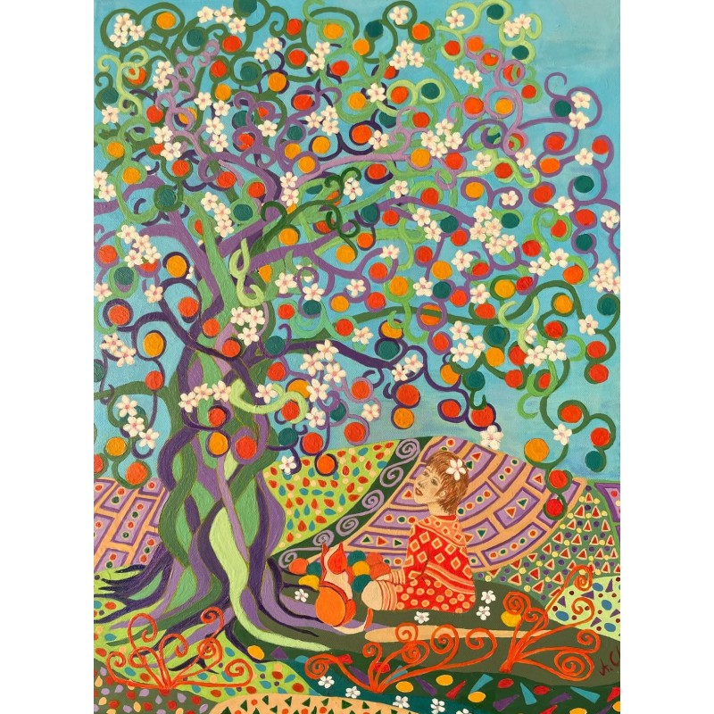 Obraz zainspirowany pobytem na Cyprze w okresie zimowym, gdzie na drzewach są pomarańcze, mandarynki, awokado, cytryny i banany, kwitną pięknie migdałowce. Stały się one symbolem radości - dziecko, które może zrywać radość w obfitości, ma wokół siebie obfitość tego czego mu brakowało.