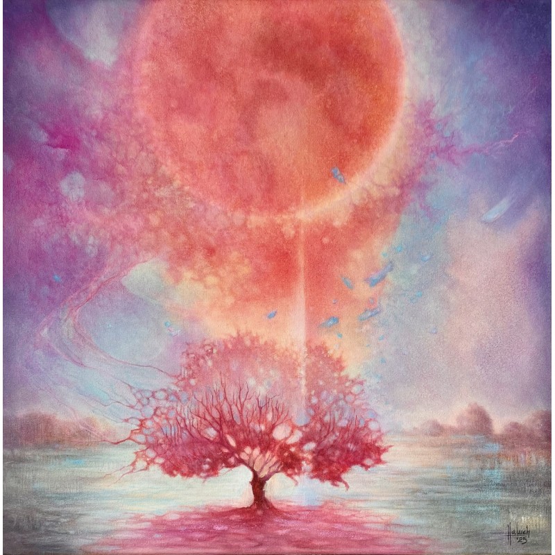 Temat inspirowany pełnią Księżyca, jego nieoczekiwanym wpływem na na biosferę.Zwłaszcza wtedy,gdy Księżyc pojawia się jako czerwona ogromna pomarańcza, cała przyroda czuje --zachwyt, ale i niepokój, czy to zwiastun czegoś dobrego/ czy też złych sytuacji?